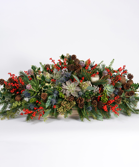 This exquisite design adds an extra sense of wonder to your holiday decor. Rustic woodland charm meets floral artisrty as an abundance of fresh evergreens are arranged in a wooden container and accented with spectacular textures such as succulents, red winterberry, mini pinecones, variegated holly, and silver brunia - making for a remarkably unique canvas of Christmas colors.