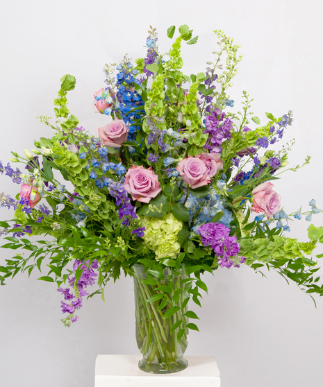 Our Serenity vase arrangement features a premium selection of blooms in shades of lavenders, purples, whites, greens, and blues.