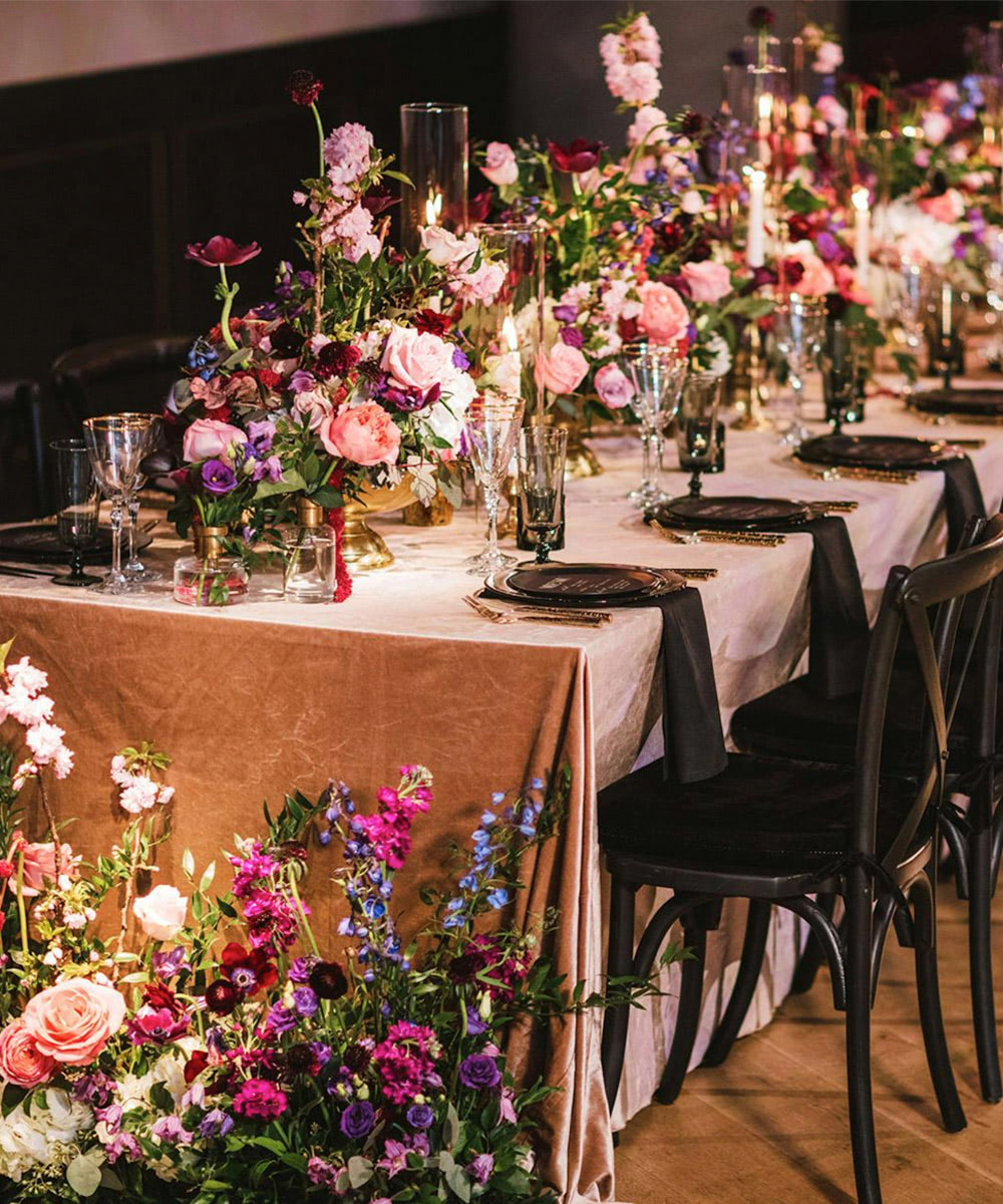 In addition to size, the shape of your table will also lead you to a specific kind of centerpiece. Perfectly round and square tables are ideal for a single statement arrangement. It can be a bit more dramatic, as it serves as the table's focal point. Think lush blooms surrounded by smaller accents like the warm glow of votive candles.