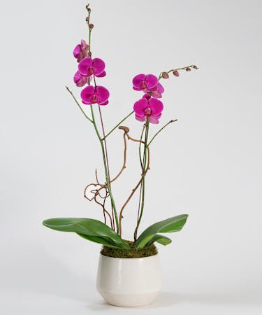 A premium double stemmed purple phalaenopsis orchid is planted in your choice of container.